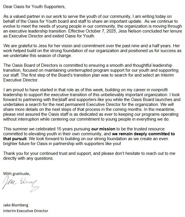 The Oasis for Youth was established by community members as an all-volunteer response to address the barriers and lack of services for the rising number of suburban youth experiencing or at risk of homelessness. Established with the support of Oak Grove Presbyterian Church, Oasis for Youth opened its doors in July of 2010 as an innovative, entrepreneurial and grassroots intervention. Working closely with schools in Bloomington, Richfield and Edina, Oasis for Youth mobilized the volunteer and financial support of local community members, churches, and civic organizations to connect homeless and at-risk youth to services and supports.